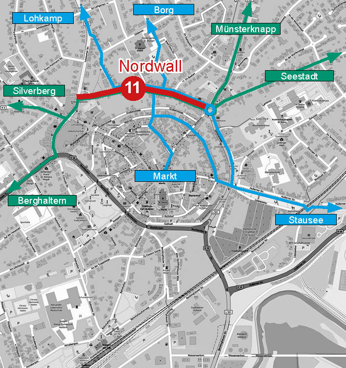 Der Nordwall bildet die nördliche Tangente der Innenstadt und ist auf beiden Seiten mit einem Radweg ausgestattet, der nur nicht als solcher ausgewiesen ist.