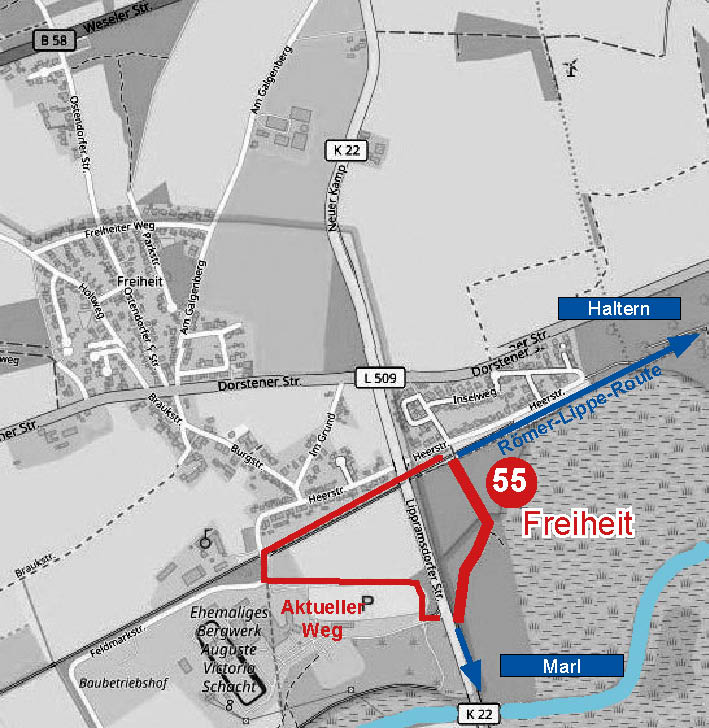 Am Südrand von Freiheit verläuft die Lippe-Römer-Route entlang der frühreren Bahnstrecke. Sie untertunnelt, die Lippramsdorfer Straße, die über Lippe und Wesel-Datteln-Kanal nach Marl und zum fahrradfreundlich gestalteten Newgate.ruhr am Chemiepark führt. Auf auf diese Brücke zu gelangen ist ein ca. 800m langer Bogen Richtung ehemaligem Bergwerk ausgeschildert und eine Querung der Kreisstraße K22 erforderlich. Für Berufspendler und Ausflügler ist eine direkte Verbindung der beiden wichtige Routen wünschenswert.